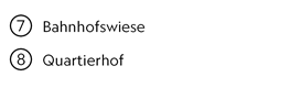 Zwei neue Plätze, neue Wege, grosse schattenspendende Bäume, eine Wiese und viele Sitzgelegenheiten laden zum Verweilen ein. Ein Hof mit Bäumen und Spielplatz liegt im Zentrum des Quartiers.